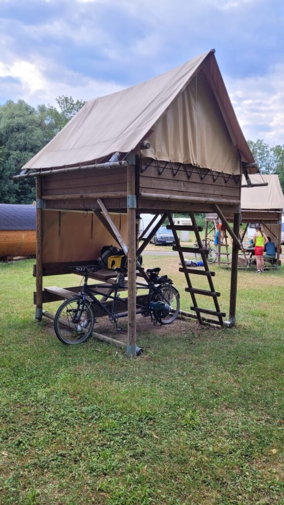 Unser Zelt haben wir an einem netten Bauernhof-Campingplatz aufgebaut, leider mitten im abendlichen Regenschauer. Jetzt trocknen wir uns wieder, im Unterstand welchen es hier für Radfahrende extra gibt.