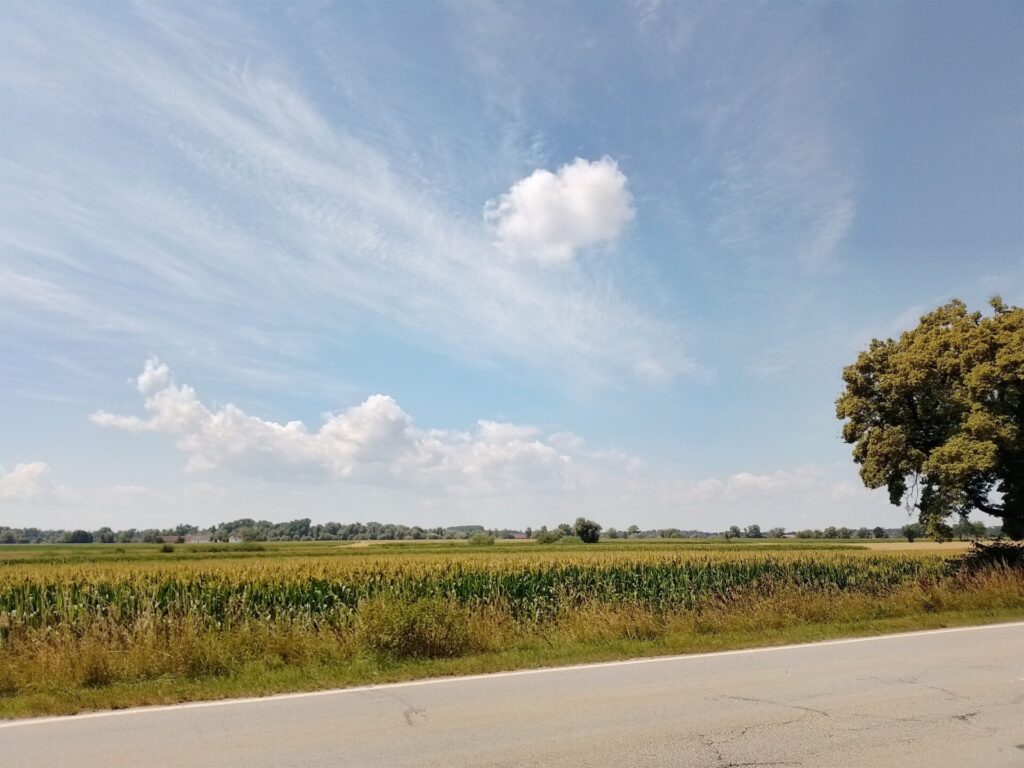 Wir haben heute in recht kurzer Zeit viele Kilometer gemacht. Mit einer durchschnittlichen Geschwindigkeit von 20km/h sind wir flott unterwegs. Natürlich weil es hier wirklich flach ist und ausserdem so ziemlich den ganzen Tag genieselt oder richtig geregnet hat.